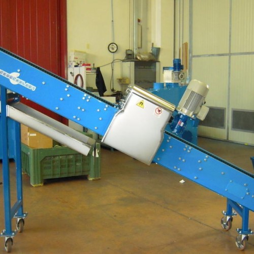 Banda transportoare, potrivită în special pentru încărcarea morilor cu lame, este prevăzută cu o rolă magnetică pentru separarea fierului de materialul care urmează să fie transportat și un panou lateral flexibil pentru o izolare optimizată. Este compusă dintr-un cadru robust din tablă pliată cu grosimea de 3 mm, un canal de descărcare bidirecțional din oțel inoxidabil pentru materiale feroase și neferoase și un transportor cu țeavă deschisă susținut de role conice. De asemenea, este echipată cu roți cu opritoare pentru o mișcare ușoară.